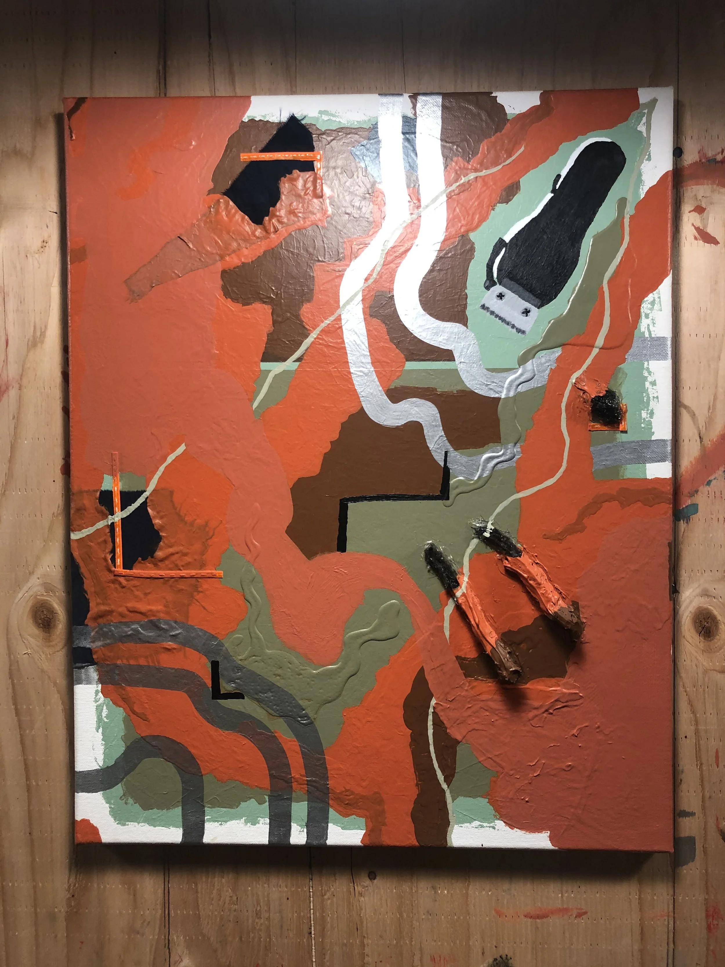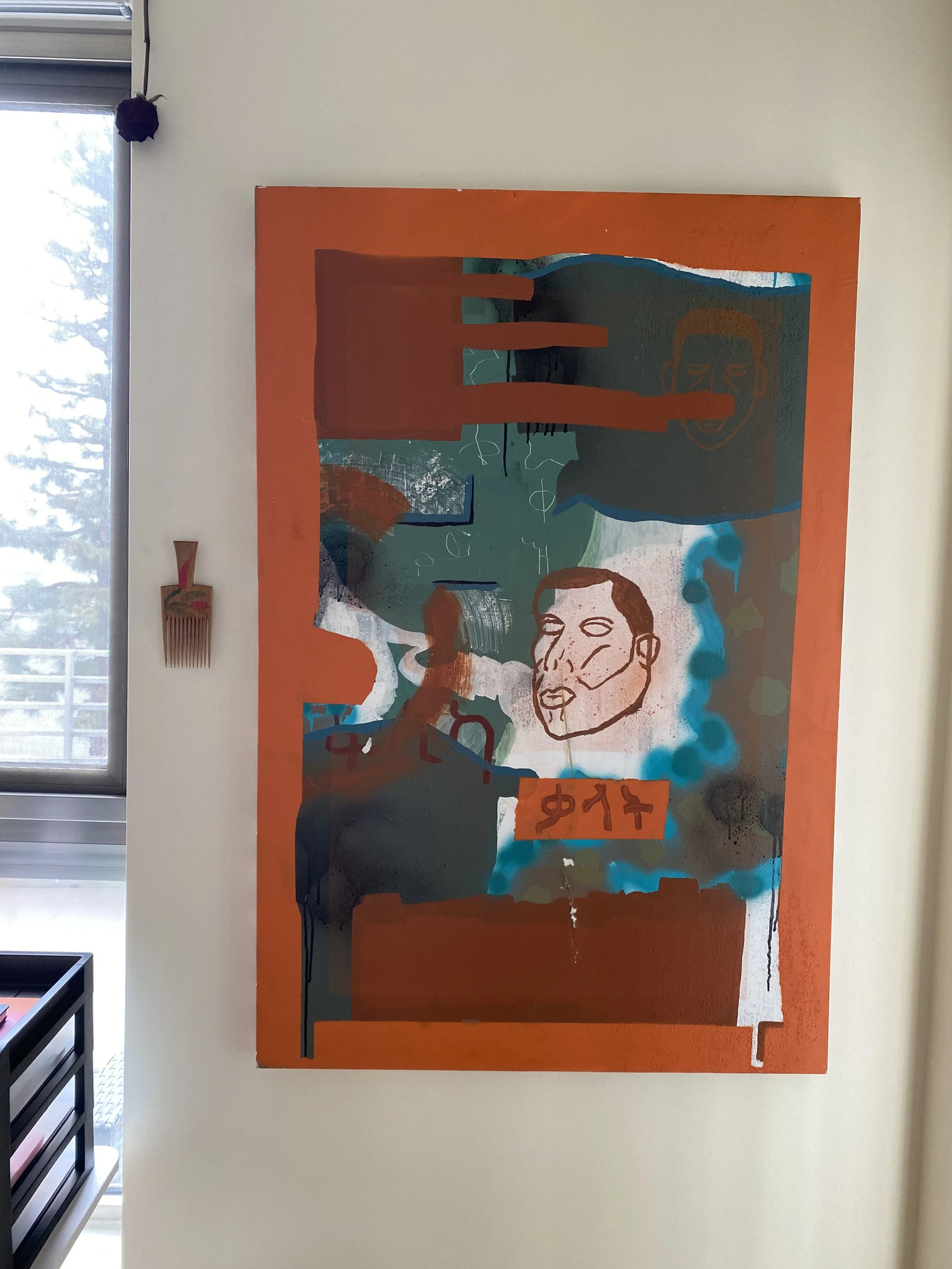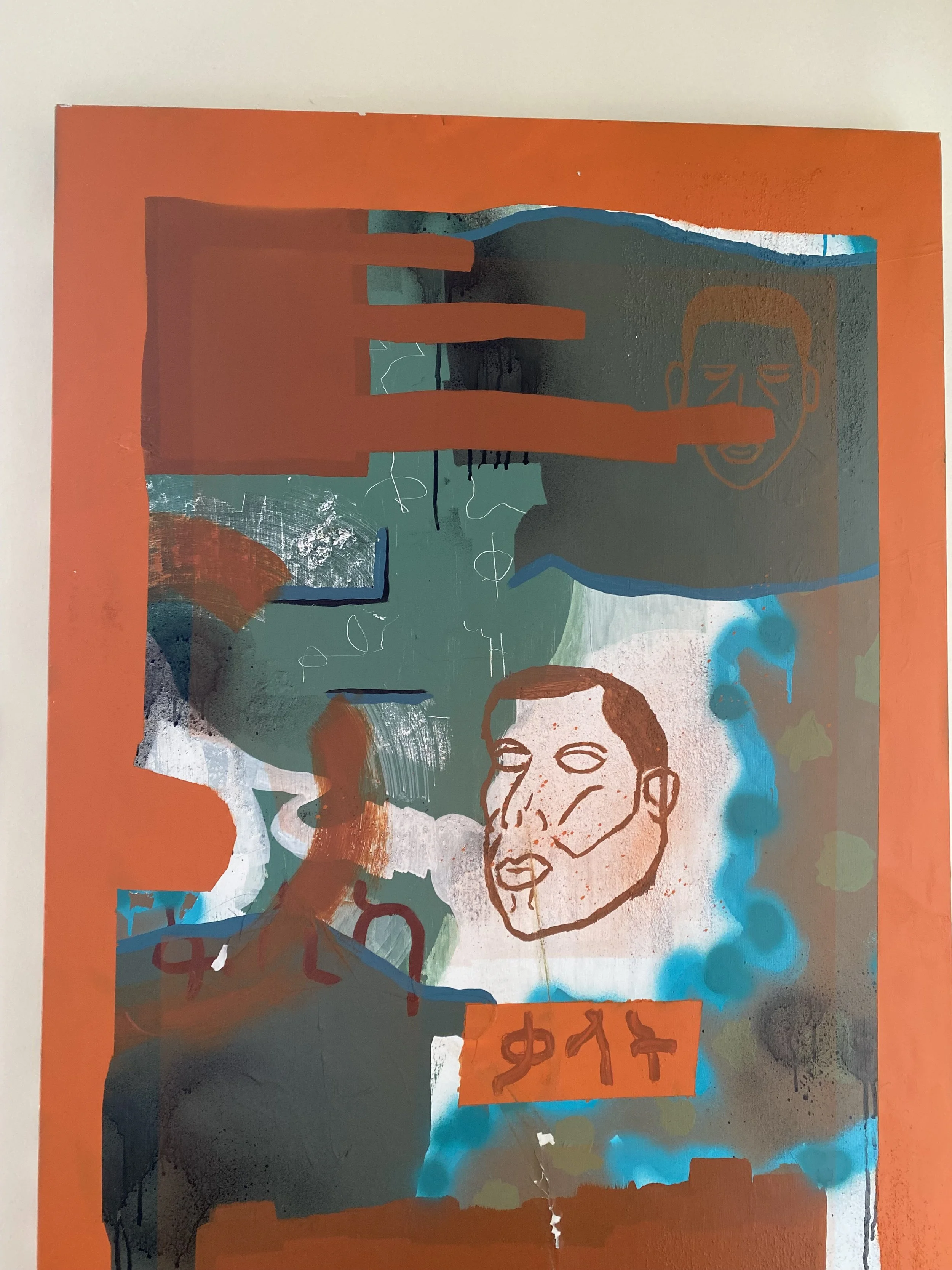 Acrylic paint, oil paint, spray paint and Ethiopian coffee grounds on recycled canvas.