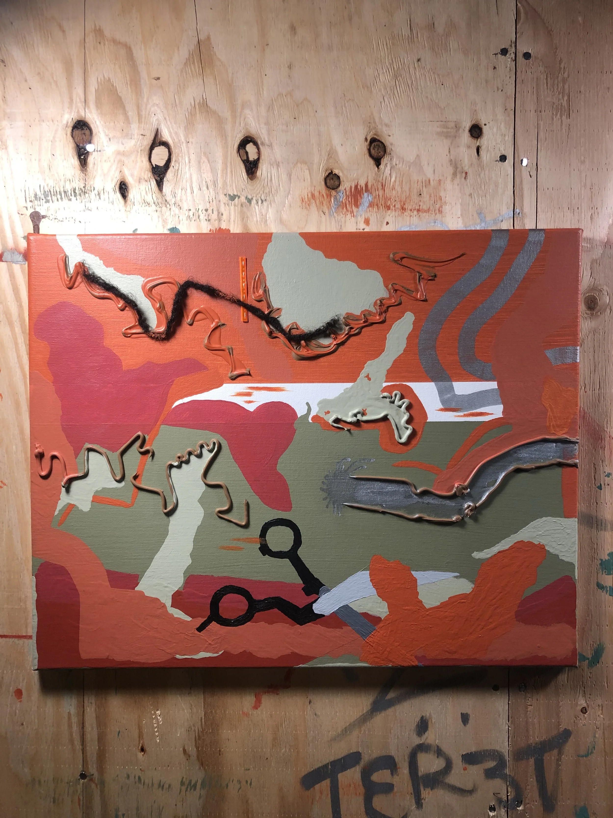 Medium: Acrylic paint, oil paint, spray paint, mesh fabric, dreadlocks, hot glue, on recycled canvas
