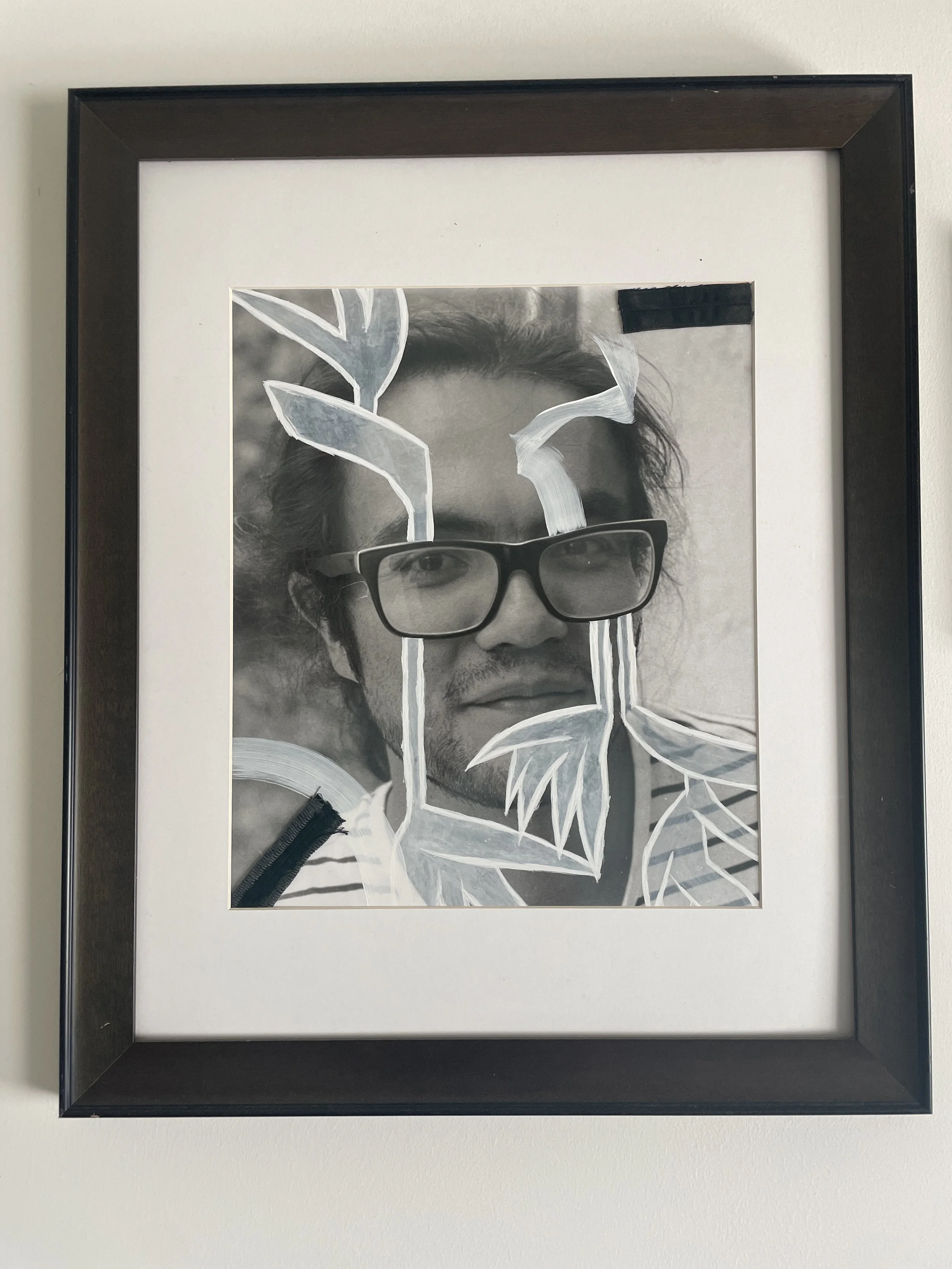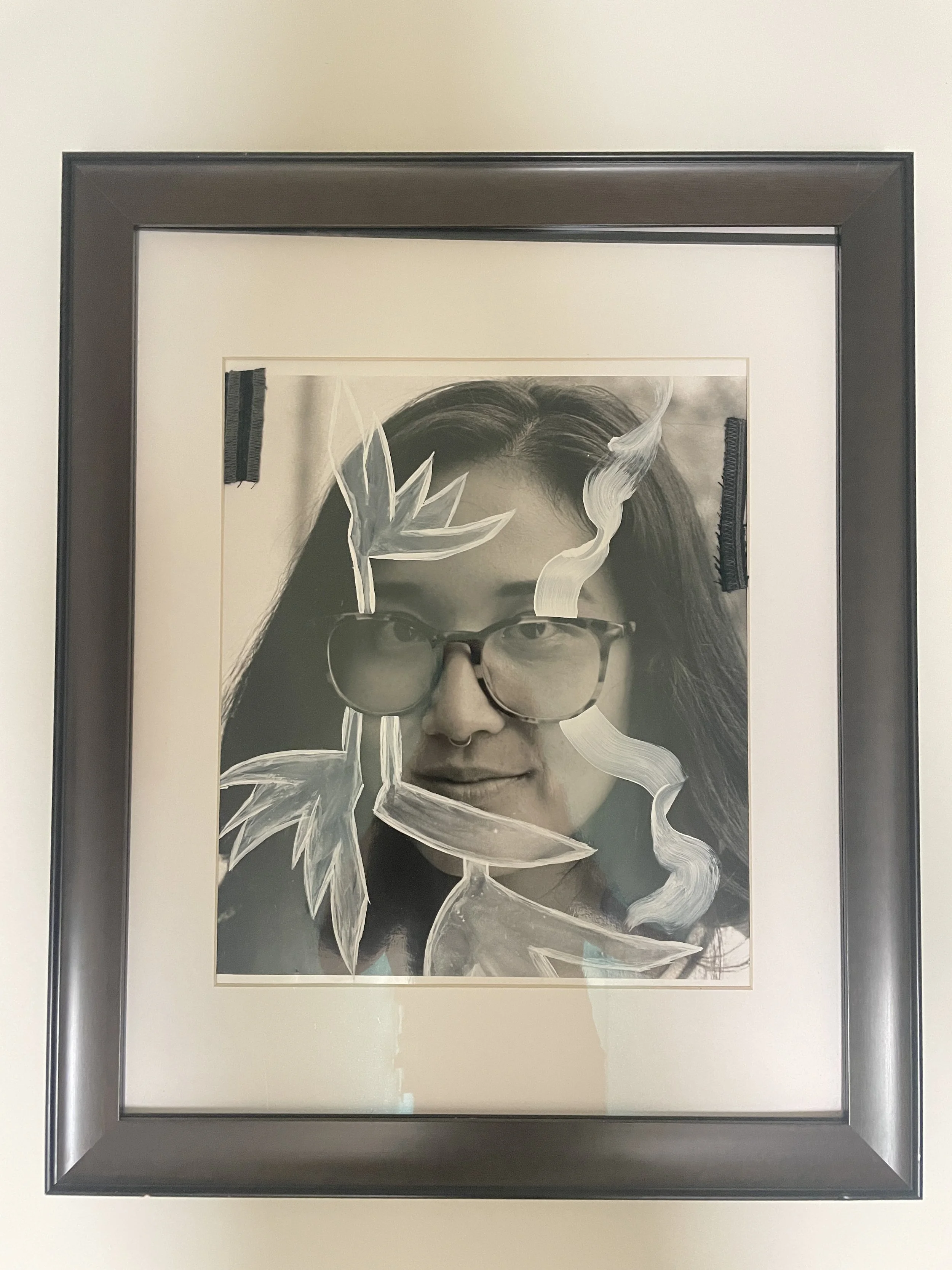 Acrylic paint, black denim, on printed silver gelatin photo paper